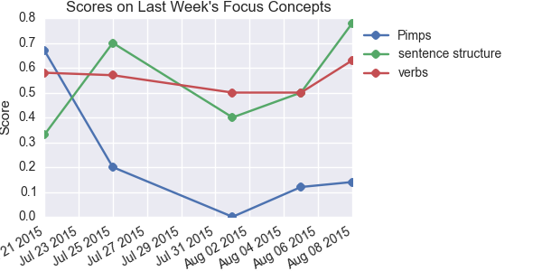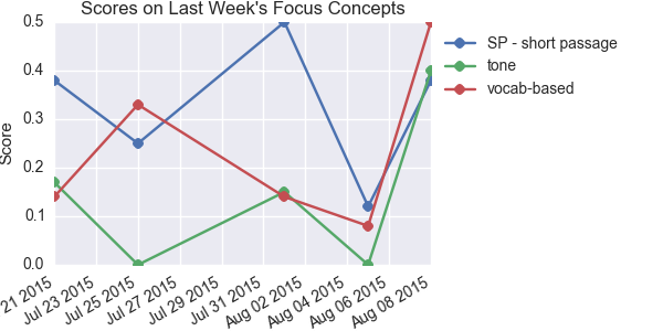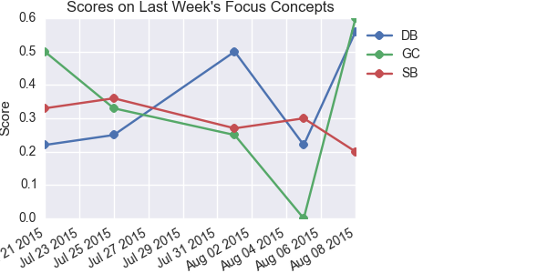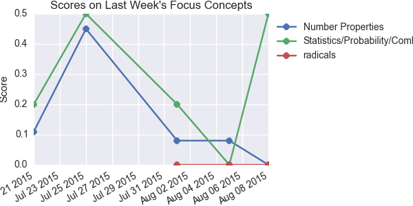 Concepts where the student is furthest behind the rest of the class. The plot shows progress on these concepts since the beginning of the course.