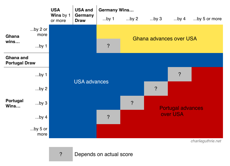 I was stressing out about whether team USA would make it out of Group G going into their game vs. Germany, so I made a chart. I posted it to a couple of social media sites and it generated 400,000 views in 24 hours.