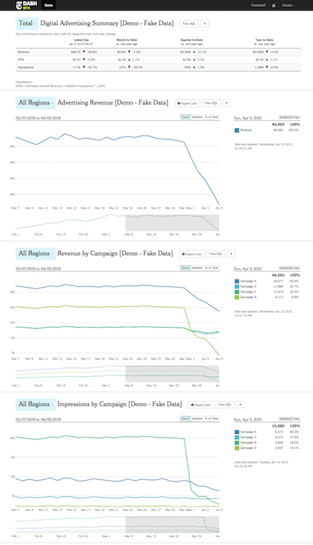As a data visualization engineer for the New York Times, I worked with a team of 4-6 to develop an interactive visual dashboard for business intelligence analytics. By the time I left, we had built over 100 up-to-date charts for 18 teams throughout the company.