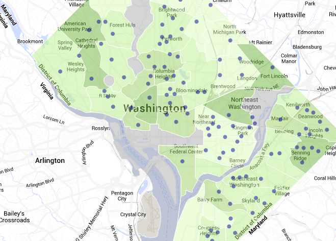 An interactive map of statistics displaying where resources and well-being vary in D.C. A volunteer collaboration with Nick McClellan et al through Datakind